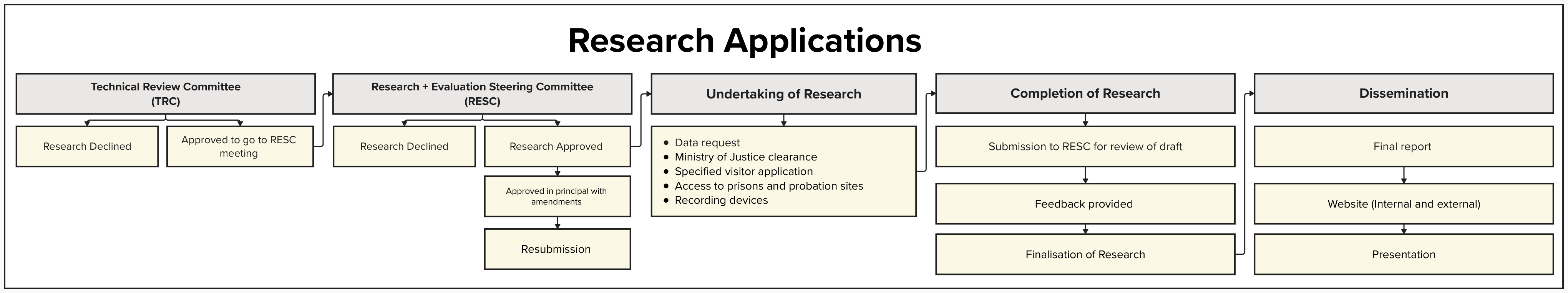 People who wish to carry out research with our staff, people under Corrections management or using our data require approval from the Research and Evaluation Steering Committee (RESC) to proceed.