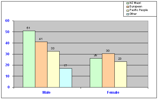 Information on ethnicity and re-imprisonment is shown in Table 5. Ethnicity is recorded by the Department at the time of reception to prison, and reflects the offender's self-reported ethnicity. Figures indicate that Maori offenders have the highest rates of reconviction, followed by NZ Europeans, then Pacific offenders. These differences are likely to be a reflection of a number of confounding variables. For example, the Maori sub-group of offenders was on average younger than the European (see Appendix 1: the age distribution of Maori and non-Maori are somewhat different, with Maori tending to feature in larger numbers in younger age bands). Maori are also more likely to be serving time for offences which have high "base rates", such as dishonesty offences. Similarly, Pacific offenders tend to be in prison for offences which have relatively low base rates (violence, sex). Although the higher re-imprisonment rate for Maori no doubt contributes to the disproportionate number of Maori in prison, its impact is dwarfed by the very large numbers of young Maori who enter the criminal justice system for the first time each year.