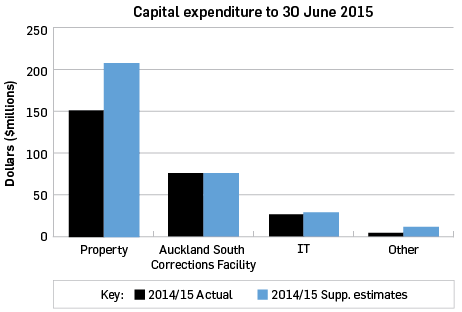 Corrections incurred $263.2 million of capital spend in 2014/15. This comprised $80.3 million to complete the Auckland South Corrections Facility, $151.8 million for property assets, $26 million on Information Technology and $5.1 million on other items such as fleet and plant replacements.