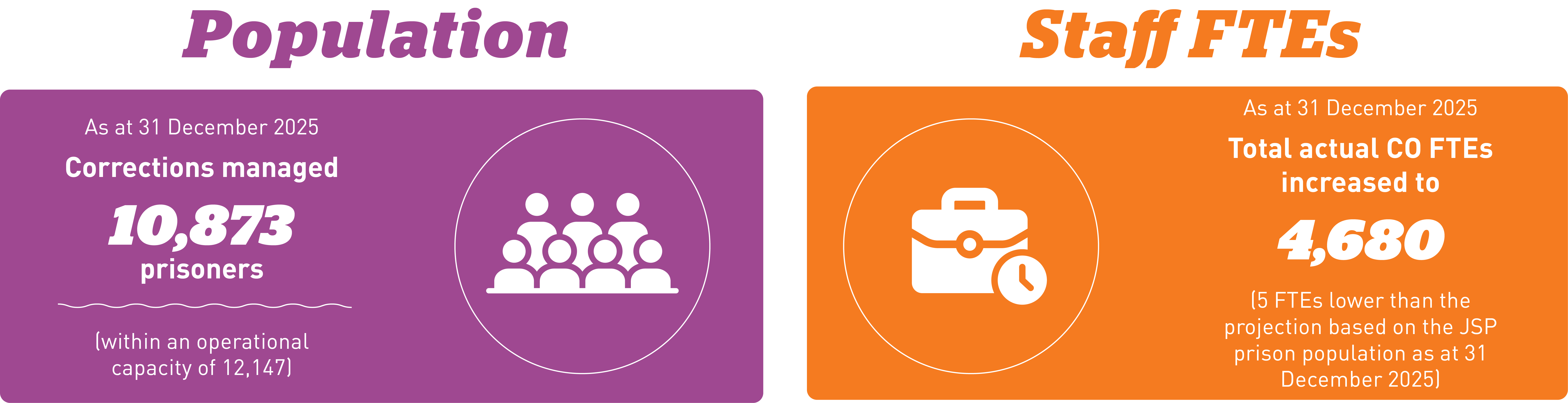 - At 31 December 2025 Corrections was managing 10,873 prisoners. The actual prison population at 31 December is higher than the Budget 2025 planning assumption of 10,860 by 30 June 2026 (Budget 24 planning assumption of 10,000 by 30 June 2025).